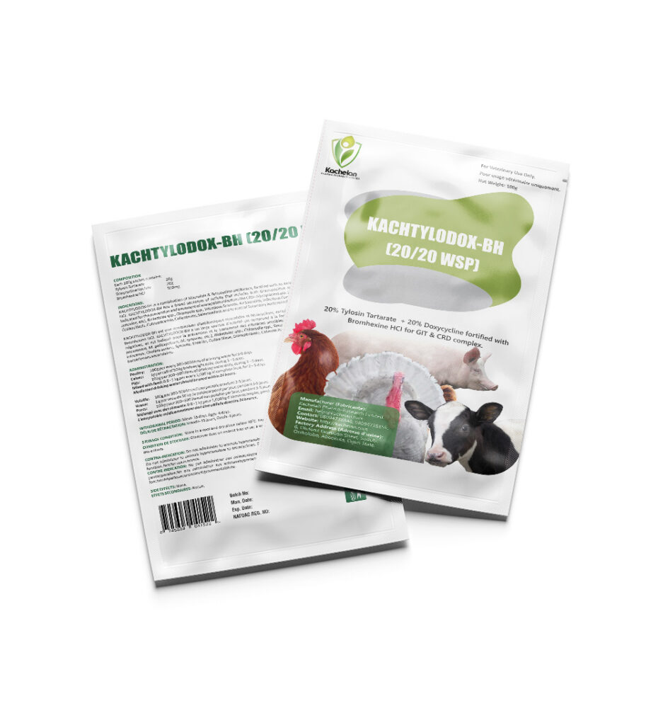 Kachtylodox-BH (20/20 WSP) is a broad spectrum antimicrobial indicated for the prevention and treatment of susceptible infections such as CRD‑ Mycoplasma spp., (M. pneumonia. M. gallisepticum, M synoviae, etc), Ricketsiae spp., Chlamydia spp., infectious sinusitis, Air sacculitis, Infectious Coryza, Fowl Cholera, Bacterial Enteritis such as Colibacillosis, Colisepticeamia, Colienteritis, Salmonellosis and other secondary bacteria infections.